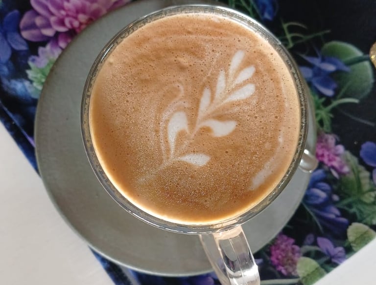 Flat white with caramel syrup paired with pecan coconut biscotti